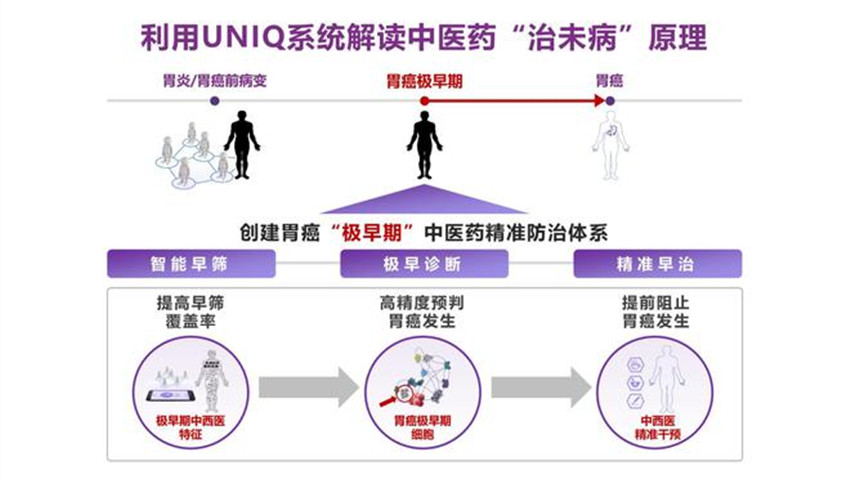 利用UNIQ系統,結合大規模臨床病例的采集和檢測,李梢帶領(lǐng)團隊發(fā)現了胃癌“極早期”這一全新的階段,中醫上主要表現為本虛標實(shí)、寒熱失衡。從中醫典型病例中還發(fā)現寒、熱舌苔菌群等新型標志物,尤其是首次構建了胃炎癌轉化的單細胞網(wǎng)絡(luò ),發(fā)現了與胃早癌細胞高度接近的胃癌極早期細胞。經(jīng)2700余例胃炎癌轉化序貫病例樣本驗證,發(fā)現該標志物能夠使得胃癌發(fā)生的預判提前10個(gè)月,準確率達85%。探測出的胃癌極早期細胞如果處于萌芽期,進(jìn)行中藥干預就可能延緩甚至阻斷其癌變,有望為解決我國胃癌早診率低的難題提供突破口。
