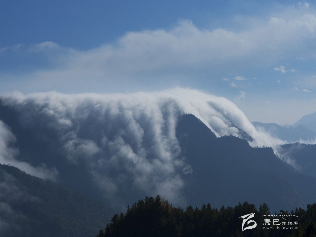 牛背山最為變幻無窮的,當(dāng)屬云海。從山頂向下望去,四周云海茫茫,時(shí)而舒緩,時(shí)而洶涌,潮起潮落。當(dāng)云海移至深谷處,會(huì)因?yàn)榫薮蟮穆洳疃纬善俨荚疲骑w瀑?gòu)奶於?,氣?shì)磅礴,蔚為壯觀。“寵辱不驚,閑看庭前花開花落;去留無意,漫隨天外云卷云舒”。云卷云舒的景象,大概只有在牛背山才能被演繹得如此淋漓盡致吧。難怪有人這樣描述牛背山:“泥巴山、瓦屋山、峨眉山、夾金山、四姑娘山和二郎山在前, 貢嘎雪山在側(cè), 大渡河大峽谷在后, 幾乎天府之國(guó)的所有名山峻嶺在此時(shí)都變成了玲瓏盆景。而翻滾的云霧之下, 群山丘陵逐級(jí)降低, 緩緩融入稻浪翻滾的天府平原。”