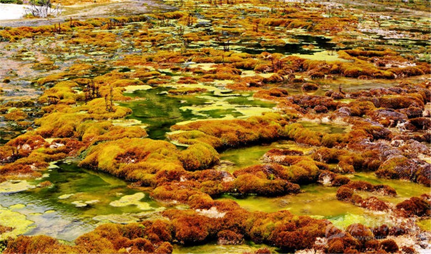 灘長約3000米,寬約200米,共有7個臺階,上面形成了大小不一的彩池,里面的各類水生植物,暢游的羌活魚(小鯢)等,給這片古老的地質奇觀帶來了無限的生機。在海拔4300米處,有一眼噴出1.5米高的溫泉,水溫常年在30度左右,是玉龍泉華灘的主要水源。
