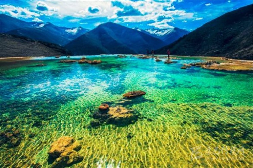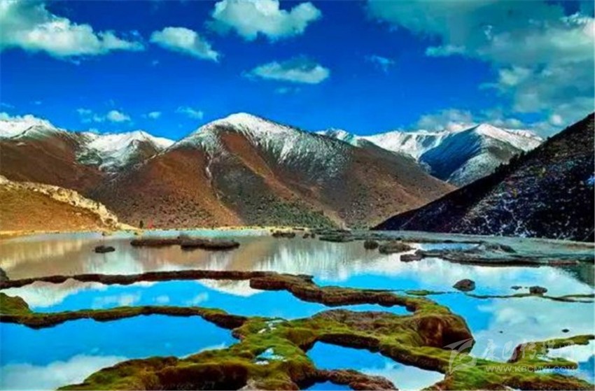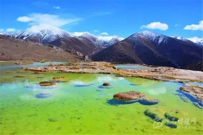 泉華灘海拔約4000米,屬于高山河谷草甸地貌。東南面就是貢嘎山,這里是觀看“蜀山之王”的絕佳位置。它因一種含有大量化學(xué)物質(zhì)的泉水在地表產(chǎn)生化學(xué)沉淀而成,從另一個山頭傾斜下來大片的白色鈣化土,延伸到谷底后便變化出四層五彩的鈣化池。每個階地上有十幾個大小不同、形態(tài)各異的五色彩池,水深40-70厘米,彩池里水草相依,石花點點,疑為瑤池降臨人間!