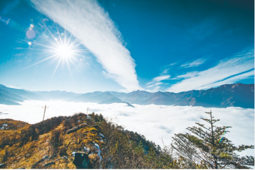 在阻隔灣壩通往外域的山脈中,有一個地方名為小卡子。一條簡易的林區(qū)便道通往那里。從這條便道穿越峽谷的最陡處,越過林線的高度,最終將會馳上一條刀刃狀的山脊。脊的兩側(cè),西為著名的大雪山、貢嘎山,東為令牌山、則爾山。這條山脊的海拔在5000米左右,這是足以傲視群山的高度,而且恰恰又是云層頂端的高度。常常溝底陰云低罩,山腰云霧繚繞。到了山脊,天空頓時空闊遼遠,艷陽高照,而山脊的兩側(cè),云海飄渺,宛若仙境。而遠處的山巒大多又在云層之上,峰高云低,如孤島浮舟。