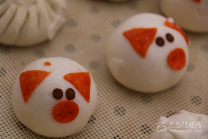 “這個包子也長得太可愛了吧!”記者順著旁邊的驚呼聲看去,五歲的肖紅拿著一個做成小豬樣的包子對著她奶奶說。趕緊走近店里,記者也來了份兒奶黃餡兒的卡通小豬包子,一口咬下,奶黃順著缺了的口子流出來,趕緊吸了一口,甜甜的味道瞬間在舌尖化開。為了滿足記者的好奇心,老板介紹說:“將面團捏好搟薄,再包入餡,收口朝下,像包包子那樣捏好口,捏出有點像豬的型狀,再撕一點黃色面團做個豬鼻子,用一根筷子按下去成兩個鼻孔,再捏兩只耳朵和一根尾巴,準備些黑芝麻,做眼晴,拿根筷子點點水沾一個芝麻放在豬身上,可愛的卡通小豬包就做好了?!钡赇伹皵D滿了小朋友,老板告訴記者:“這種卡通包子之所以受小朋友的喜歡不僅是因為其可愛的卡通外表,而且我們所有的卡通包子餡兒都是甜的。我們精準定位,投孩子們所好,取得的成效還不錯。這次來參加美食節(jié),只帶來了小豬和刺猬兩種卡通形象的包子,賣得挺好,準備在接下來的幾天將小猴子等卡通形象的包子也帶過來。”