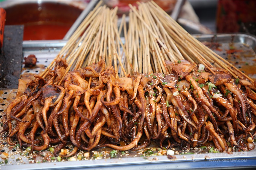 作為一個四川人,對于麻辣味的食物毫無抵抗力,在康定后街林立的商鋪中,記者一眼就相中了“深海魷魚花”這家店??粗褐t油的魷魚花靜靜地躺在紅椒和芹菜間,記者咽了咽口水,向老板買了一份兒?!罢媸羌兗兊拇ㄎ秲簺]錯了,又麻又辣的。”記者對老板說。老板回答到:“魷魚花最講究的就是刀法了,要切得好看。雖然在顧客看來都差不多樣子,但是我每次都要經(jīng)過細細斟酌再一刀一刀的切,爭取多弄幾種樣式,現(xiàn)在我的??蛡円矔毤毜乜季课仪械聂滛~花了。以前我只賣烤魷魚,只是在家里偶爾會給我兒子做魷魚花,后來看我兒子喜歡吃,才開始慢慢地賣魷魚花,沒想到還是很受歡迎。這次美食節(jié),我發(fā)現(xiàn)沒有人做魷魚花,所以我就帶著我兒子喜歡的魷魚花來參加這次美食節(jié)了。”老板笑著跟記者說。