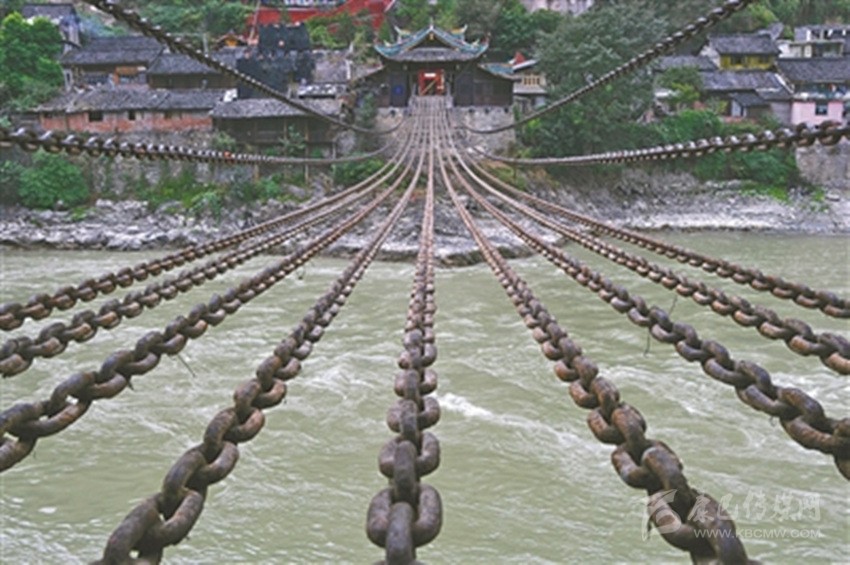 “瀘定橋”有人又稱“鐵索橋”。相傳康熙帝統(tǒng)一中國后,為了加強(qiáng)川藏地區(qū)的文化經(jīng)濟(jì)交流而御批修建此橋,并在橋頭立御牌。1935年,中國工農(nóng)紅軍在長征途中“飛奪瀘定橋”,使之成為中國共產(chǎn)黨重要的歷史紀(jì)念地。1961年,瀘定橋被中華人民共和國國務(wù)院公布為第一批全國重點(diǎn)文物保護(hù)單位之一。瀘定橋全長103.67米,寬3米,由橋身、橋臺、橋亭三部分組成:橋身由13根碗口粗的鐵鏈組成,左右兩邊各2根,是橋欄,底下并排9根,鋪上木板,就是橋面。每根鐵鏈由862至997個(gè)由熟鐵手工打造的鐵環(huán)相扣,總重量達(dá)21噸。