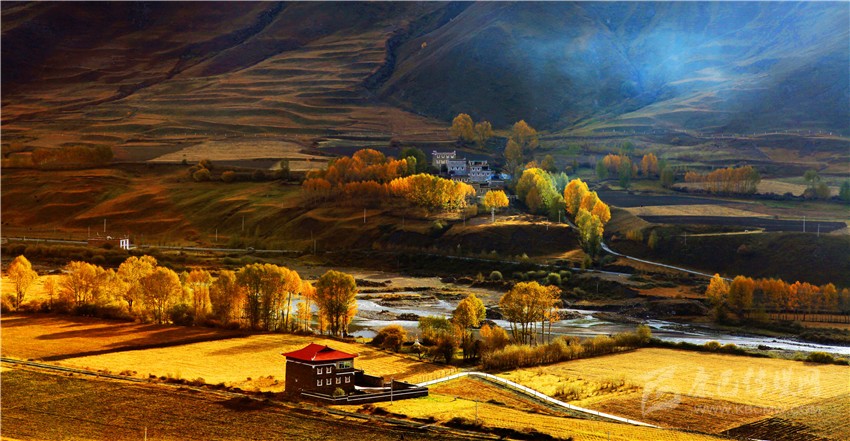 沿著公路行駛,您會看到公路兩邊的青稞都已金燦燦,綠葉變黃,溪水靜靜流淌,小樓上的經(jīng)幡隨風(fēng)舞動,白塔依稀林立,陽光照耀下的東路各縣市的空氣中充收獲的氣息。 藍(lán)天白云,小橋流水,金黃色的白楊樹,精美的藏式小樓,在光與影的映射下,仿若一幅油畫,等待您的發(fā)現(xiàn)和欣賞。