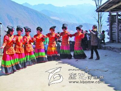 在磨西的青崗坪村,在被冰雪覆蓋的山巒眺望著的村莊,春節(jié)來(lái)臨的日子,彝家 兒女打開(kāi)了彝家的美酒,燦爛的陽(yáng)光搖曳濃烈的酒香,穿上紅紅的彝家服裝,彝家的女兒手拉手跳起舞。