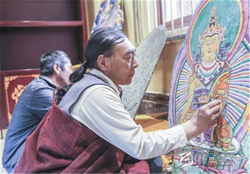 從子承父業(yè)再到吸眾家之長,自離開故鄉(xiāng)的那天起,巴德的視野開始變得開闊起來。1979年到省藏校學(xué)習(xí)藏文和美術(shù),并開始涉獵泥塑技藝,隨后又向德格民間藝人扎西澤郎學(xué)習(xí)彩繪石刻,然后又到西藏、甘肅等地學(xué)習(xí)繪畫、石刻技藝。巴德說,自己之所以有今天的藝術(shù)造詣,是因?yàn)橛幸慌麕熤更c(diǎn),是因?yàn)樽约旱牟粩嗵剿骱烷L期堅(jiān)守。讓他欣慰的是,自己的三個(gè)兒子都在學(xué)習(xí)石刻和繪畫,親戚朋友中的十多個(gè)孩子也成了他的入門弟子。