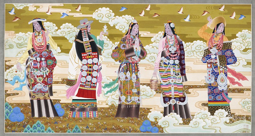 青藏高原有著曠遠(yuǎn)弘大的人文地理,有著神秘久遠(yuǎn)的宗教文化傳承,正是這蒼茫大地孕育了藏族人;正是這片極度追求審美體驗(yàn)并把生活高度藝術(shù)化的疆域,滋養(yǎng)了西藏藝術(shù)。從早期的巖畫(huà)、旗幡畫(huà)、唐卡、壁畫(huà),再到當(dāng)代的丹青重彩,無(wú)不生發(fā)于這片神奇高原,皆是中華民族文化寶庫(kù)中燦爛的牟尼寶珠。唐卡繪畫(huà)肇啟于松贊干布隆興之時(shí),向南學(xué)習(xí)印度、尼泊爾布畫(huà),往西受到犍陀羅藝術(shù)浸潤(rùn),向東融合唐、宋、明、清之審美,再集藏地宗教文化、民族審美熔為一爐,鑄就一千三百年唐卡繪畫(huà)之法脈。它不僅是獨(dú)具魅力的藏文化之血脈源流,更是各民族文化交融、和諧互生的典范,對(duì)世界藝術(shù)有著深遠(yuǎn)的影響。