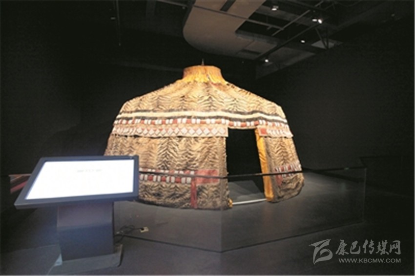 從體積上來說,“虎皮帳篷”確實(shí)是館藏文物當(dāng)中最大體量的一件物品。在眾多文物中,它的名聲在外。根據(jù)它的型制,人們測量虎皮圍度,訂制鋼架,四五個人同時搭建,才呈現(xiàn)出人們現(xiàn)在所看到的蒙古包樣式。這頂鑲海貝虎皮圓頂帳篷,共計(jì)108張虎皮。整體由二幅扇形帳頂,四幅近長方形帳圍,共六幅組成蒙古形式帳篷。其上點(diǎn)綴海貝作裝飾,帳主體為虎皮面料,間有豹皮、獺皮、駱駝皮等,有紅色粗棉布里襯。