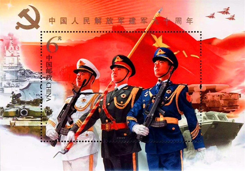2017年8月1日,中國(guó)郵政發(fā)行《中國(guó)人民解放軍建軍九十周年》紀(jì)念郵票小型張“聽黨指揮”(圖8)。郵票畫面上“八一”軍旗飄揚(yáng),各軍種英姿颯爽,背景襯托各軍種高尖端裝備,描繪了我軍戰(zhàn)士聯(lián)合作戰(zhàn)的畫面,既表現(xiàn)了中國(guó)人民解放軍威武雄壯的軍容和現(xiàn)代化水平,也表現(xiàn)了在黨的指揮下,人民軍隊(duì)忠實(shí)履行保衛(wèi)祖國(guó)、捍衛(wèi)和平的神圣使命。