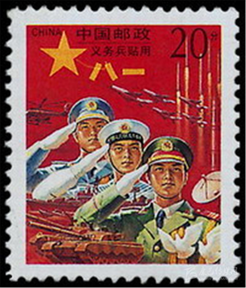 1995年8月1日,原郵電部試發(fā)行一套“義務(wù)兵專用”郵票一套1枚(圖5),票名為“神圣的使命”,圖案以紅光四射的“八一”軍旗為背景,以現(xiàn)代化的飛機(jī)、坦克、火箭和象征和平的白鴿為襯托,畫面是威武的陸??杖?,顯示我軍鋼鐵長(zhǎng)城般功無不克、戰(zhàn)無不勝的精神風(fēng)貌。