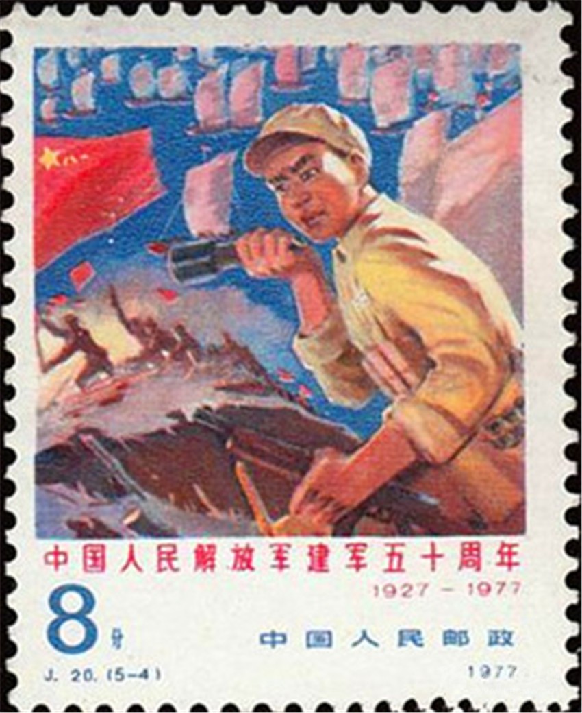 1977年8月1日原郵電部發(fā)行的《中國(guó)人民解放軍建軍50周年》紀(jì)念郵票,其中第4枚“雄師過大江”(圖3),圖案中一名沖在渡江隊(duì)伍前面的戰(zhàn)士高舉一面“八一”軍旗。