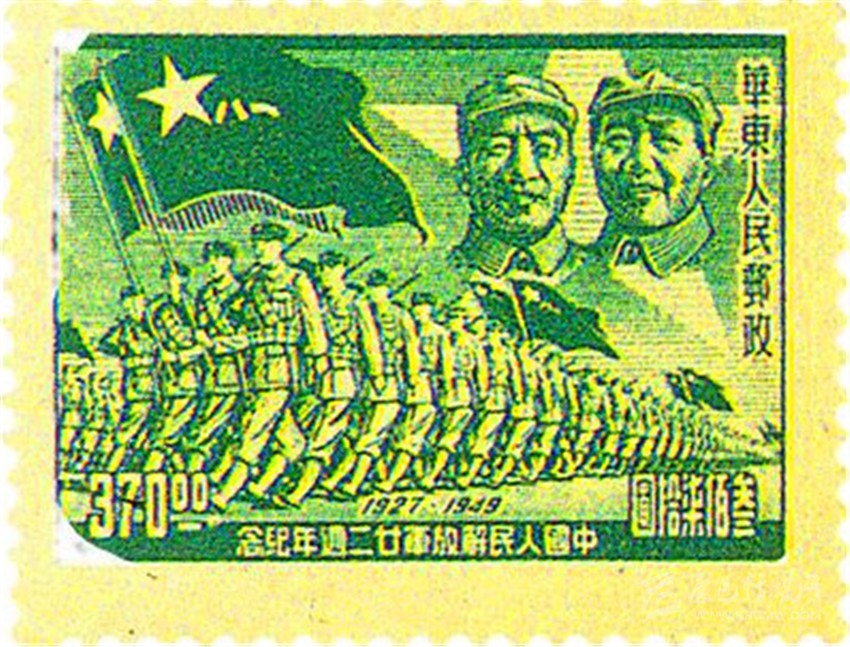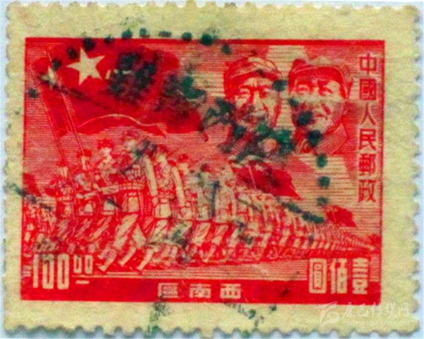我國(guó)最早出現(xiàn)“八一軍旗”的郵票,是1949年8月1日, 剛解放的上海華東人民郵政發(fā)行的《中國(guó)人民解放軍建軍22周年》俗稱《華東進(jìn)軍圖》郵票(圖1),一套5枚,同圖異色異值,郵票右上方為毛澤東主席和朱德總司令頭像,下方是鐵流般的人民軍隊(duì)高舉著一面面“八一軍旗”。 同年12月,西南區(qū)人民郵政又發(fā)行一套11枚圖案相同“西南進(jìn)軍圖”郵票(圖2)。