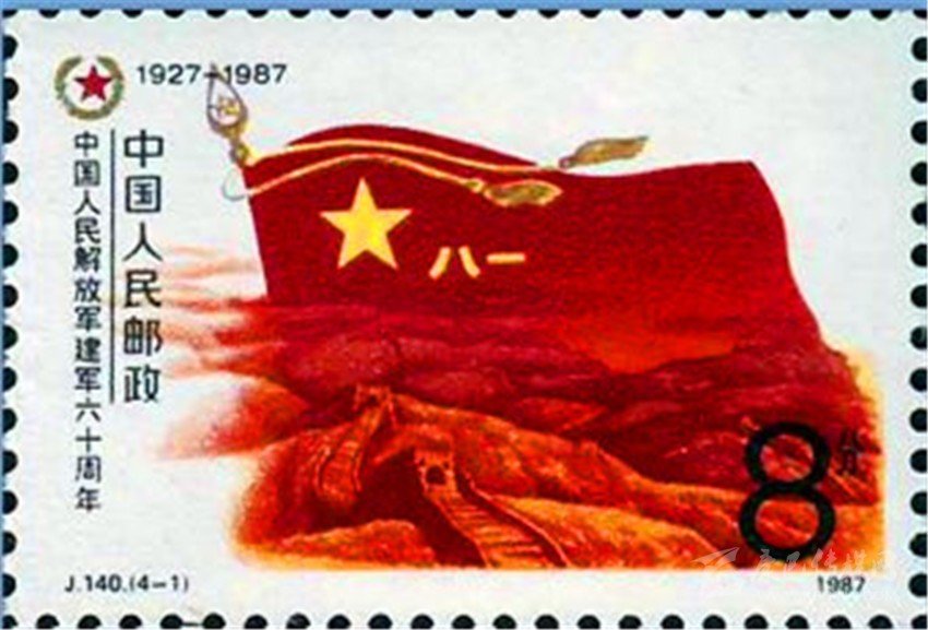 1987年8月1日原郵電部發(fā)行的《中國(guó)人民解放軍建軍60周年》紀(jì)念郵票一套4枚。其中第1枚“軍魂”(圖4),郵票上一面鮮紅的“八一”軍旗迎風(fēng)飄揚(yáng),旗下是蜿蜒的萬里長(zhǎng)城,代表了中國(guó)人民解放軍是保衛(wèi)祖國(guó)和人民的“鋼鐵長(zhǎng)城”。