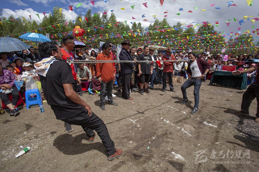 除以上活動,滾桶接力、俯撐馬鞍吃葡萄、穿藏裝揉糌粑、套牛角等趣味比賽無不展示民族體育的獨特風(fēng)格?!斑@種拔河還是第一次見,很有意思?!逼渲校案裢獭北荣悾ò褞ё犹自诓弊由习魏樱┥畹糜^眾喜愛。