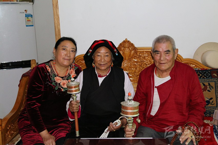 過了一會(huì)兒,兩位步履蹣跚的老人先后走了進(jìn)來。其中,一位杵著拐杖,一位搖著經(jīng)筒?!昂炔琛⒑炔??!币姷接浾咭恍?,老人十分熱情。