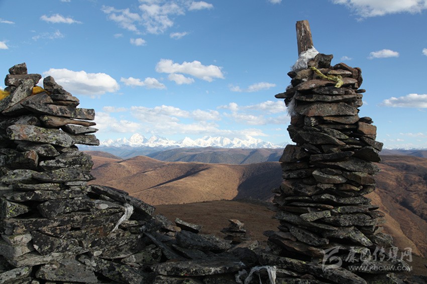 在高爾寺山頂,一個(gè)標(biāo)注有海拔4412米的藍(lán)底標(biāo)志牌顯得有些孤單,與之相伴的,除了呼嘯的大風(fēng)外,還有隨風(fēng)飄動(dòng)的嘛呢旗。頭頂?shù)乃{(lán)天沒(méi)有一朵云彩,遠(yuǎn)處的雪山格外潔白耀眼,曾經(jīng)繁茂的小草已經(jīng)枯黃了,幾朵不知名的野花在寒風(fēng)中書(shū)寫(xiě)著最后的輝煌,仿佛在向人們宣誓著它的存在。