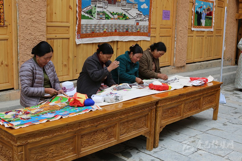 在藏繡展點(diǎn),5名農(nóng)牧民婦女正在合繡一幅藏族建筑刺繡作品。“我從16歲開始跟著父親學(xué)藏繡,傳到我這已經(jīng)是第四代了。除了‘六長壽’、度母像等傳統(tǒng)圖案,今年是新中國成立70周年,我還繡了一幅天安門作品?!?7歲的傳承人達(dá)打介紹道。