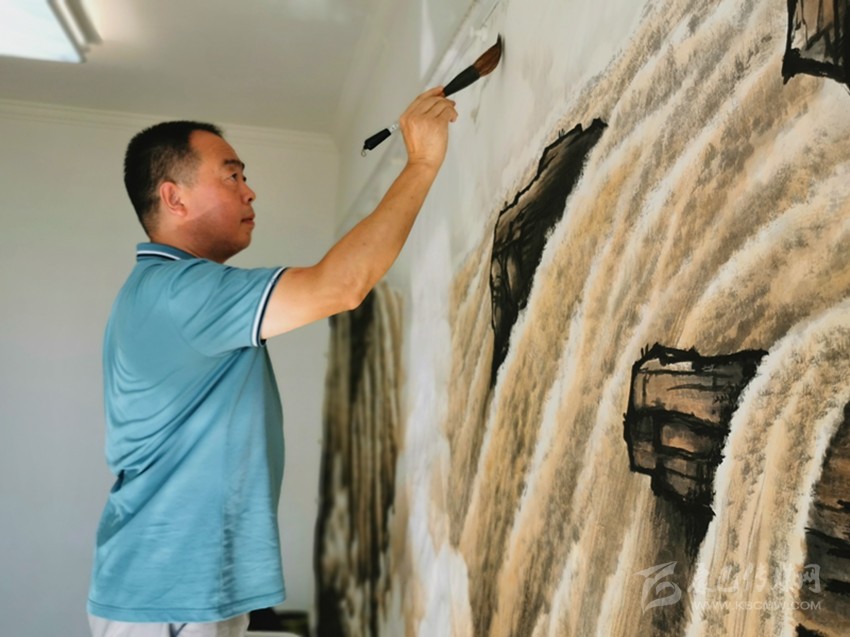 整面的雪白墻壁上,安掛著巨幅畫作《黃河在咆哮》。這幅長達5米多,寬近2米的畫作著實的大,裴宏波需要邊畫邊休息,否則體力不夠。完成河水的著色后,裴宏波停筆下梯,聊起了另一畫作——“康定新八景”,這正是記者此行的目的。