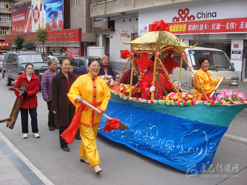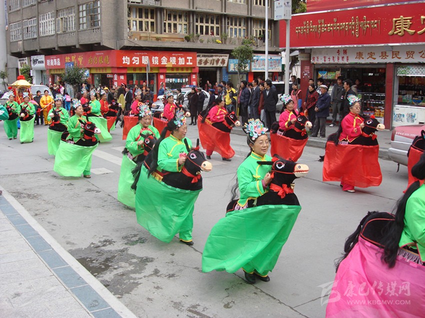 半個世紀(jì)風(fēng)靡康定城的“船燈”、“馬馬燈”、“鬧山鼓”、“扭秧歌”、“笑頭和尚戲柳翠”、“霸王鞭”……整個兒就像老陜過年時的“社戲”場面。大年初一、十五夜“出燈”游街,熱鬧氣氛把整個年節(jié)塞得滿滿的。記得我孩童時見過一次“出燈”游行,不是晚上而是在大白天(叫“出游”)。寺廟喇嘛吹奏佛樂走在前面,接著是“川北”人的川劇鑼鼓;再后面跟著的就是“馬馬燈”、劉老陜的“船燈”、鐵木社的“龍燈”、二輕局的“霸王鞭”、南門上的弦子隊、三居委的腰鼓隊、北三巷的“道孚鍋莊隊”……游行隊伍遇街口寬敞地方必圍圈演出?!叭死侠?,人老啦,人老先從頭上老,白的多來黑的少, 開——船——羅!”“銀須飄灑”的艄公劉老陜用俏皮逗趣的陜腔告白開場詞,在歡喜鑼鼓的伴奏中“劃”著旱船出了場。旱船闖“急流”、過“險灘”,風(fēng)趣又逼真;如果哪家的姑娘打扮成古裝戲里的嬌美仕女坐上旱船游了街,那她立馬就成了康定城人皆贊譽的“美女”。接著就是“馬馬燈”,幾十個“騎馬橫槍”的古裝將士馳騁上場,排兵布陣,穿梭并行,“馬”鈴聲鼓樂聲交織一起……鬧翻了康定城的“三山二水”。