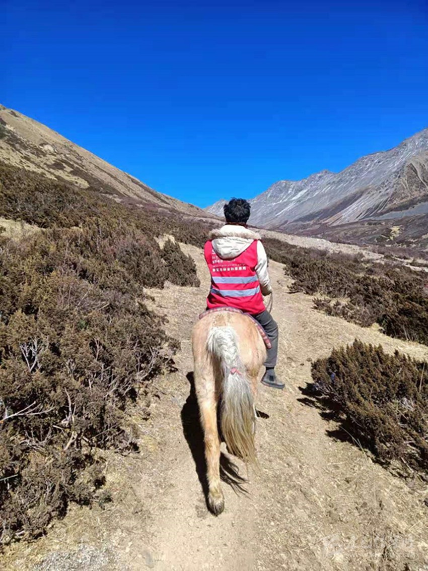 囑咐一人將知瑪澤仁帶下山后,布呷和其余三人迎著朝陽,騎馬繼續(xù)在崎嶇的山道上前行,他們要趕在中午時分到達(dá)子梅埡口,將攝影愛好者和游客們留下的垃圾撿拾完后,馱在馬背上運到集中處理點。而在沿著山脊行走的途中,他們還需隨時觀察,防止兩旁林子起火,給“迷路”的背包客指路,以及救助一些受傷的野生動物。