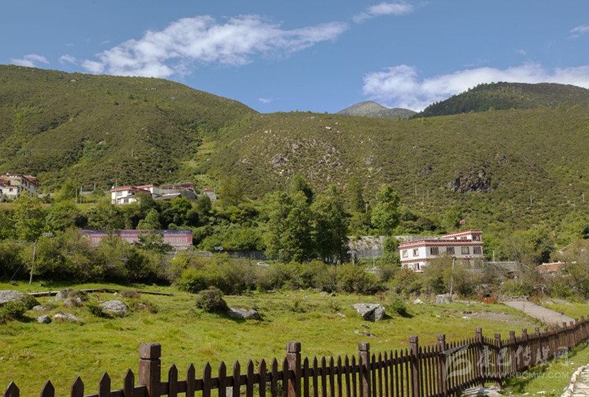 折多塘村房舍現(xiàn)多數(shù)沿公路兩側(cè)筑建。其實沒通公路前,山間馱道應是村后呈椅狀的一片草坡上。草坡邊自古就有的一方露天溫泉池塘水霧彌漫,熱氣蒸騰,正應了前人所記“山凹有熱泉沸起”、“憇啞池塘,帳宿于折多”;且在舊時馭馬馱牛的行旅中宿棧,這寬大的草坪方適合繃搭帳蓬和放牧牲畜,露天溫泉又可洗濯行旅之勞頓。