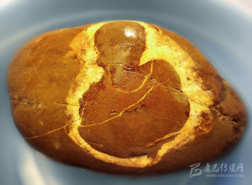 作為一個無組織的業(yè)余獨(dú)行淘石者,經(jīng)過數(shù)年的摸、淘、琢磨,我悟出:發(fā)掘趣石最重要的是要獨(dú)具慧眼慧心,會讀石紋。是否讀懂石紋,決定著一塊石頭是頑石還是奇石的命運(yùn)。這是一件很難的事,不僅要運(yùn)用你獨(dú)特的審美視角,還得發(fā)揮你豐富的想象。有時,為了讀懂一些石紋,我會抱著這塊石頭如考古學(xué)家般仔細(xì)琢磨,從正面、側(cè)面,再到背面,又從左邊旋到右邊,或者上下顛倒來打量……一番冥思苦想,會意會神,直到靈感涌起、慧心頓悟,尤如洞天石扉訇然中開,眼前的頑石拙巖,頃刻便化為藝術(shù)珍寶,令我欣喜若狂。正如悉達(dá)多說:“這塊石頭是石頭,它也是動物,也是神,也是佛,我敬重它和熱愛它,并非因?yàn)樗谐蝗諘兂蛇@個或那個,而是因?yàn)樗缇褪沁@一切,一直是這一切?!背錆M靈性的石頭在你和美妙的自然間搭起了一座通靈的橋梁。淘得趣石,還需緣分。就像人與人的相遇講究緣分,遇到心儀的石頭也講究緣分天助。有年春節(jié),我與父親去河邊轉(zhuǎn)游,面對涪江寬闊的石灘,我的淘石癮又犯了。但出門前答應(yīng)過父親,這次只逛不撿石頭。我知道老爸心疼我一個女子大過年的撿石頭。河邊冷,且石頭扛起來很重,手與衣服都會弄得很臟。我邊陪父親漫走閑聊,眼睛卻止不住往河灘逡巡,仍希望無意中淘到中意的石頭。走著走著,我發(fā)現(xiàn)有一群鳥歡唱著從遠(yuǎn)處一個石堆飛起,冥冥中感覺那里有寶貝,遂向老爸懇求,過去看一下就回來。來到那個石堆中心,幾乎不費(fèi)什么功夫,就看到一塊橢圓形石頭上有著一個自帶金色佛光圈的如來佛半身像。我怔住了,有點(diǎn)不敢相信如此幸運(yùn),蹲在那里久久打量。老爸隨后趕過來,看到佛像石,連連贊嘆了好幾句“太神奇了”。然后,他毫不猶豫地就幫我把石頭搬起來就走?;氐郊抑?,如獲至寶的我,趕緊清洗石頭,在清水的滋潤下,佛像的輪廓更加清晰。頸上的佛珠、袈裟線也分明,細(xì)看令人叫絕的這竟是一尊三面佛:正面、左側(cè)向、右側(cè)向均是佛。而在此石背面,也清晰出現(xiàn)了一個草書的“吉”字,真令人喜出望外。吉佛石,就這樣神奇地走進(jìn)了我的生活,讓我相信一切緣分都是可遇不可求的。