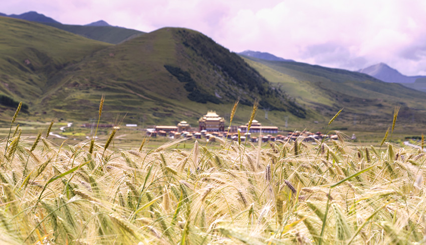 甘孜縣地處橫斷山脈的東北邊緣,康北地區(qū)腹心地帶,雅礱江從這里緩緩流過(guò),肥沃的土壤和無(wú)垠的土地總會(huì)配上澄徹晴朗的天空。一顆顆飽滿(mǎn)金黃的青稞常在風(fēng)里搖晃著秋天,“康北糧倉(cāng)”的美在這時(shí)展現(xiàn)得淋漓盡致。