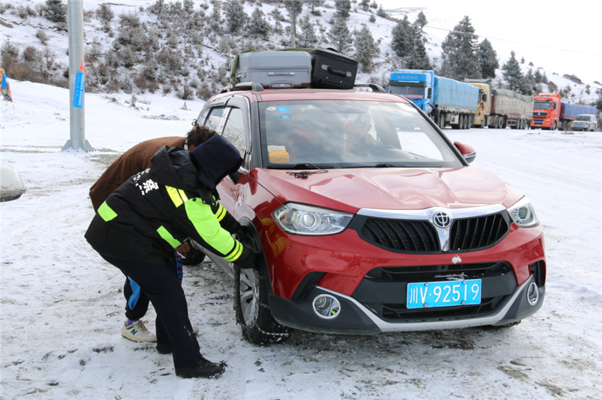 日前,受強降雪天氣影響,國道G248丹巴縣東谷鎮牦牛溝路段路面積雪結冰情況嚴重,丹巴縣公安局交警大隊聞?dòng)嵍鴦?dòng),第一時(shí)間按照縣局春運道路交通安全管理工作要求,及時(shí)調整勤務(wù),部署警力。通過(guò)設置臨時(shí)檢查點(diǎn)、交通安全提示牌配合交警勸導的方式,提示過(guò)往駕乘人員遵守交通法規,安全文明行車(chē)。同時(shí)幫助進(jìn)溝車(chē)輛懸掛防滑鏈,并加強路面巡查,及時(shí)援助受困車(chē)輛,保障道路安全順暢。