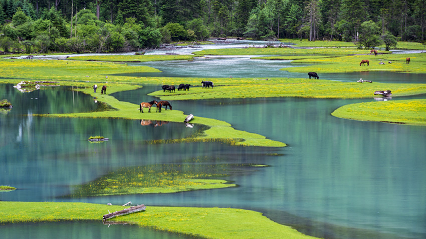 走進(jìn)月亮湖,彎彎的湖水呈耀眼的寶綠色,湖邊是綠悠悠的草地,在這里扎營感覺就像是住進(jìn)了綠野仙蹤的童話世界里。