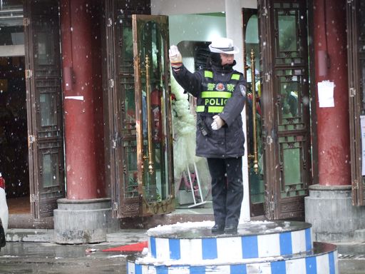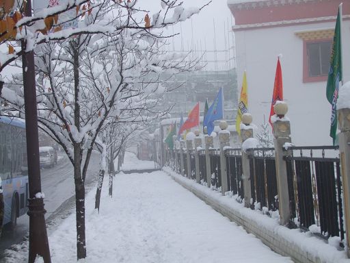 康定秋意正濃,河岸的楊柳還未泛黃,卻意外地迎來了一場不期而遇的降雪,也是今冬康定迎來的第一場雪。大片的雪花輕盈落下,康定城和跑馬山一片銀裝素裹,分外妖嬈。13日早上,康定城依然下著鵝毛大雪。這場深足30厘米的雪,使入冬以來一直持續(xù)的干燥空氣變得濕潤,雪景美不勝收,但也給人們出行帶來許多不便。記者在街道上看到車流量和行人明顯減少,機動車都放慢了速度,以確保行車安全。上學(xué)的學(xué)生,上班的人群都都裹上了厚厚的冬裝,小心翼翼地行走在雪地上。交警依然堅守在紛飛的風(fēng)雪中指揮交通;環(huán)衛(wèi)工人和一些單位職工迎著大雪清掃馬路和庭院積雪。記者提醒司機,雨雪天氣謹防交通事故,行人要注意因雨雪路面濕滑,謹防摔傷。