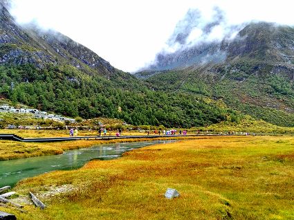 燦爛的陽光伴隨幾場秋雨秋霜過后,亞丁的秋天便更加絢麗多彩,漸黃的草地和青楊林開始爭奇斗艷,稻城的美變得更加富有層次,幾乎是一天一個(gè)變化,一天一個(gè)景色。山與水、人與情,一步一勝境。大片大片的高原草甸現(xiàn)在已經(jīng)逐漸變?yōu)辄S綠色,環(huán)抱高原海子的水草也由養(yǎng)眼的綠色向迷人的金色過渡。藍(lán)天白云、金色草甸、紅楓映白樺、秋水繞山間,幽靜的小徑,融合了感性的色彩和理性的沉靜,既有成熟的風(fēng)韻,又有灑脫的禪境。木質(zhì)棧道以“曲徑通幽”的姿態(tài)環(huán)景分布,所經(jīng)之地為負(fù)氧離子含量相對(duì)較高的森林區(qū)域,漫步林中,令人心曠神怡。無論是傳統(tǒng)的團(tuán)隊(duì)游,還是個(gè)性化的自助游、自駕游,在這里都能找到屬于自己的那份愉悅。