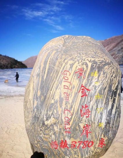 在木格措(野人海)的左邊就是被譽(yù)為“愛情灘”的黃金沙灘,很多有情人在這里許下愛情的誓言,草木生靈都作為見證。圍繞海子自然形成的沙灘在高原是很罕見的,當(dāng)春天來(lái)臨,冰面漸漸舒展開,浪花也席卷而來(lái),在黃金海岸,你可以逐浪玩沙。