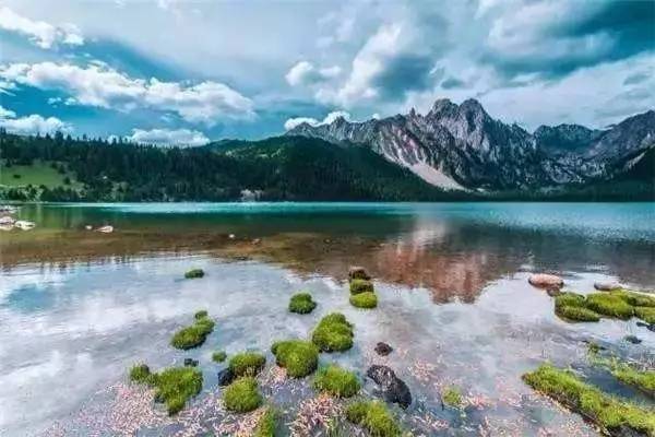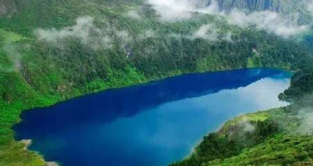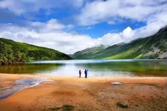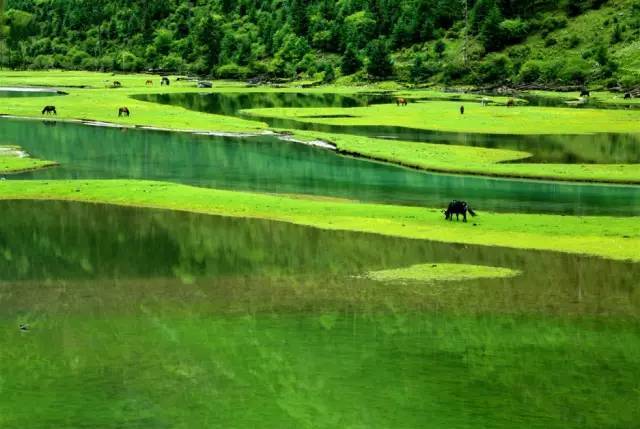被原始森林和草甸環(huán)抱的五須海,當(dāng)?shù)厝擞鳛椤跋膳釆y的明鏡”,湖水碧綠透亮,將周圍的山水和天空全映照在湖面,幽靜的像一幅畫。從夏到秋周圍百花盛開,古樹盤根錯節(jié)、藤枝攀沿纏繞,杜鵑樹伸向湖面,仿佛進入原始古樸的仙境。