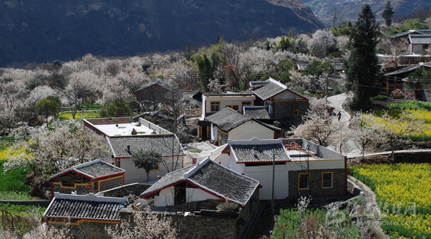 梨花成片,白如雪脂;桃花粉艷,點(diǎn)綴其間。被花海包圍的丹巴,煞是好看。