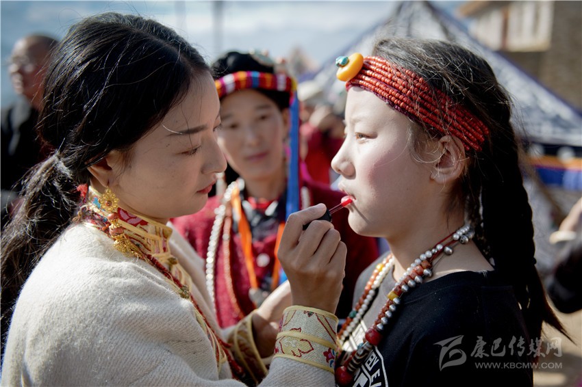 盤(pán)好發(fā)髻,佩戴好頭飾,在肩、背系好五彩哈達后,由本村具有威望的女性長(cháng)者引領(lǐng)來(lái)到儀式現場(chǎng)。法號聲中,煨桑的青煙裊裊升起,威嚴的活佛主持誦經(jīng)祈福儀式。隨后,德高望重的長(cháng)者為參加儀式的女子送祝福茶,長(cháng)輩為姑娘們獻哈達。一系列儀式結束后,無(wú)論男女老少,都來(lái)到場(chǎng)地中央,踏歌起舞,跳起吉祥的鍋莊。