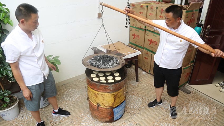用酥皮包裹好餡料,放入模具內壓緊壓實。點心脫模后在點上屬于“周聾子點心”的獨家標記(四瓣花),便可進入烤制流程,烤爐分為上鏊與下鏊。首先將吊爐上下火都提前預熱至250°左右,然后把制作好的點心正面朝下放在吊爐里,最后將上鏊移入吊爐上方,進行點心的烤制。根據(jù)經(jīng)驗確定烤制時間,當?shù)鯛t里飄出香味后,即可將上鏊挪離吊爐。點心背面呈現(xiàn)出“偷油婆色”(焦黃色)后,迅速將點心翻面,繼續(xù)烤制成褐色,出爐即可食用。