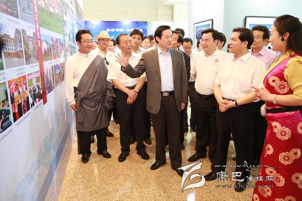 6月8日上午10時,劉奇葆、王正偉來到民族文化宮,首先走進四川甘孜藏區(qū)發(fā)展成就暨旅游圖片展現(xiàn)場。這里,展示的是甘孜藏區(qū)經(jīng)濟社會發(fā)展成就、自然風光、歷史文化、民族風情、田園藏寨等方面內容的圖片。一幅幅圖片,一個個場景,劉奇葆都非常熟悉。在四川工作期間,他曾十幾次奔赴甘孜藏區(qū)考察,足跡遍布全州18個縣。劉奇葆仔細觀看展示圖片,并不時詢問交通通信、優(yōu)勢產業(yè)等發(fā)展情況以及民生改善的情況。劉奇葆說,甘孜山川秀美,民族風情濃郁,是一方充滿生機和活力的土地,希望甘孜立足自身實際,大力發(fā)展農牧業(yè)和文化旅游業(yè),大力加強生態(tài)建設和環(huán)境保護,大力改善民生,努力走出藏區(qū)科學發(fā)展、跨越發(fā)展之路。