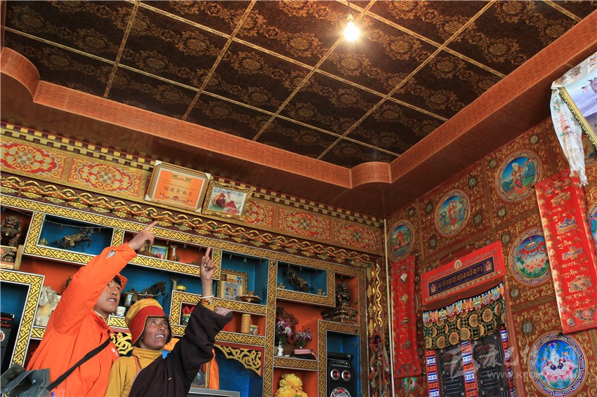 格吉大爺今年70歲了,他的孫子貢嘎是一名藏畫家,主要靠給鄉(xiāng)鄰的新房畫壁畫為生。他和哥哥兩人自學成才,鄉(xiāng)里很多人家屋內(nèi)那些精美絕倫的壁畫就出自他們兩兄弟之手。“以前電不好時,天黑就無法工作,現(xiàn)在有電了,晚上都能畫,曾經(jīng)要畫1個多月的壁畫,現(xiàn)在20多天就能完成。如今電好了,電話信號也比以前強,好多理塘縣城的朋友都打電話請我去給他們家里畫,這樣又能多掙些錢。”貢嘎的話語里透著對未來的幸福生活憧憬。
