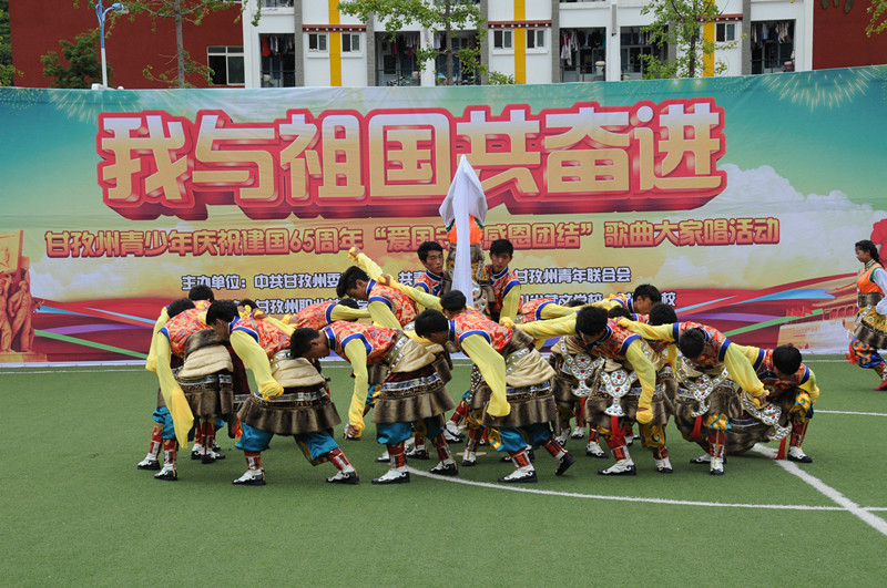 活動(dòng)中,同學(xué)們先后演唱了《黃河頌》、《我愛您,中國(guó)!》、《夢(mèng)圓中國(guó)》等多首紅色經(jīng)典歌曲。你方唱罷我登場(chǎng),現(xiàn)場(chǎng)氣氛熱烈,高潮迭起。優(yōu)美的歌聲唱出了我青少年的愛國(guó)情懷,一面面飄揚(yáng)的紅旗表達(dá)著對(duì)祖國(guó)的深情祝福。來自州職業(yè)技術(shù)學(xué)校、四川民族學(xué)院、省藏校、甘孜衛(wèi)校、州青聯(lián)委員以及我州著名歌手共1000多人放聲高歌,共同慶祝新中國(guó)成立65周年華誕。