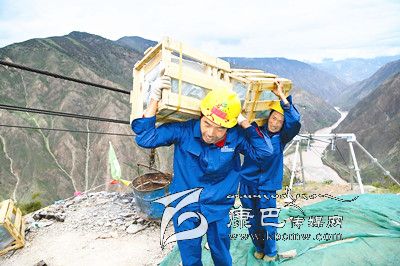 在巴塘縣水磨溝村,記者看到四川送變電公司架設的1460米跨江索道,旁邊堆放的設備背上山要花4小時,通過索道僅需幾分鐘就可運抵對面山頂基位。