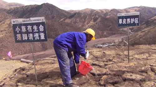 據(jù)介紹,施工前工作人員先將施工區(qū)域的原生草皮進行剝離,移至他處并進行養(yǎng)護,待施工結(jié)束后,再將剝離的草皮移回原處進行回鋪;對開挖造成地表植被破壞的地段播撒適合高原生長的草籽,直到長出綠草。現(xiàn)場的施工人員介紹說,塔基開挖過程中,先將熟土(表土)、生土分開堆放,并采取隔離(鋪設(shè)棕墊等)、攔擋、覆蓋等措施,回填時先將生土回填,熟土最后置于表面,以保證植被的恢復(fù)。
