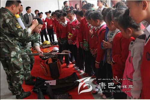 師生們在康定縣消防中隊(duì)副中隊(duì)長李勇的帶領(lǐng)下,參觀了消防員宿舍、榮譽(yù)室、軍人俱樂部等。官兵們“豆腐塊”的被子引起了學(xué)生們濃厚的興趣和強(qiáng)烈的好奇心。不少孩子親自動手,嘗試在消防官兵的指導(dǎo)下學(xué)習(xí)疊“豆腐”被子,并進(jìn)行了內(nèi)務(wù)整理。在消防器材展示環(huán)節(jié),師生們走進(jìn)車庫,中隊(duì)官兵介紹了各類消防器材裝備的名稱、性能和使用方法以及各類消防車、隔熱服、避火服、防化服和背戴空氣呼吸器等特勤器材的性能和使用方法。在消防安全課堂上,官兵們向?qū)W生們播放了《校園消防安全警示錄》,并結(jié)合實(shí)際向同學(xué)們講解了學(xué)校防火的重要性、火場逃生自救方法、初期火災(zāi)的撲救、滅火器的使用、如何報火警等基本消防知識。在聯(lián)歡活動現(xiàn)場,消防官兵傾力打造的舞蹈《小蘋果Style》贏得同學(xué)們滿堂喝彩,現(xiàn)場響起熱烈的掌聲。學(xué)生們帶來的《吉祥中國結(jié),美滿中國夢》跳出了小朋友們的美滿幸福之情。文藝演出的最后,消防官兵們還為學(xué)生們帶來了消防時裝秀,穿著各式服裝的消防戰(zhàn)士閃亮登場,向孩子們講解了這些服裝在各種災(zāi)害事故現(xiàn)場的用途。